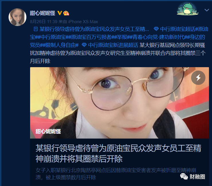 8月26日,微博用户“甜心妮妮怪”发文反映,自己入职中国银行北京陶然亭网点后,因替原油宝受害者发声被折磨至精神崩溃,被上级圈禁数月后开除。