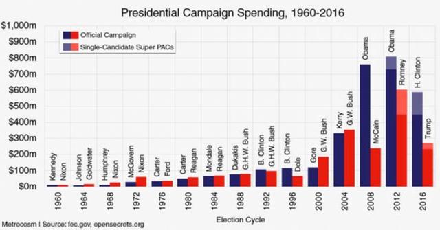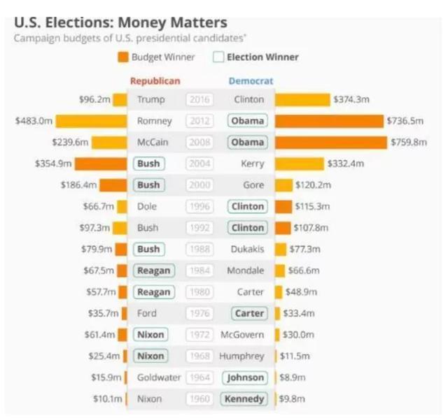 外媒表示,40年来的美国大选一直都是金钱说了算。其他一切所谓的希望,改变,信任,政策以及潜在不同都是废话。