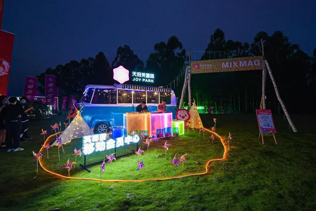 在天府芙蓉园,不时有少年中国古风快闪、爱国打卡互动等活动,身穿汉服的表演者们,在五彩的灯光下以震感鼓舞、古风舞的现代化演绎,彰显了文化自信与国家强盛。摇滚摄影展、手工客、电影放映室等“慢生活”活动的艺术展铺展在商业艺术街区,潮食市集、潮乐街头、以花为主题所打造的文创市集,为找回生活仪式感提供了丰富的场景。