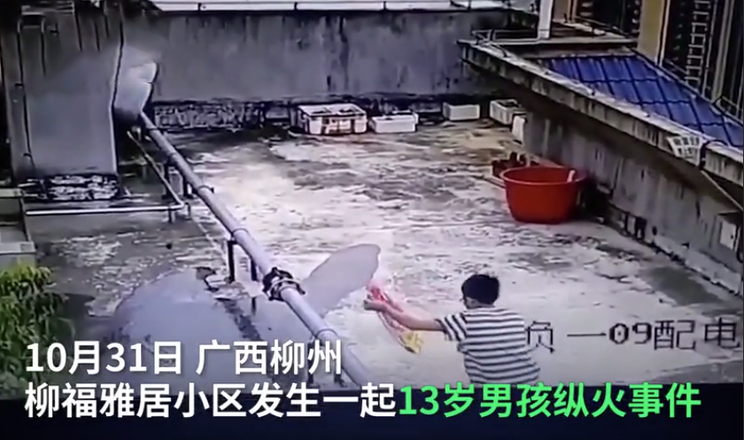 大火无情,每一次火灾事故的发生,都有可能会酿成重大的惨剧。轻则可能只是财产受损。严重的话,很可能有人会为此付出宝贵的生命,因此我们要时刻树立防火意识。可是在现实生活中,有些人却因为各种原因,竟然会人为纵火。10月31日,广西柳州就发生了这样的一幕。 据媒体报道称,2020年10月31日,广西柳州一小区内发生一起火灾。监控记录了全过程,从监控画面中我们可以看出,。一名小男孩儿手提一桶液体,然后倒在地上,随后他点燃了一个编织袋儿,然后丢在地上,大火迅速燃烧并开始蔓延。 火灾发生后,物业的工作人员第一时间赶往现场进行灭火,所幸此次火灾事故并未造成人员伤亡。民警也很快到达了现场,将涉事的男孩儿带回警局进行调查处理,至于具体的情况,目前我们还不得而知,要以警方最终的通报为准。 客观上来讲,发生这样的事情也说明了男孩儿家属教育的失职。如今,事故已经发生,只希望警方能够做好善后处置工作,严惩纵火的男孩,只有让他真正的知道疼,他才可能会悔改,以后才不会犯下更大的错,最后,不知大家对此作何感想?