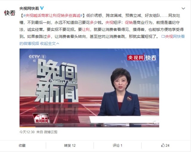 [size=100px][size=0.18]IT之家11月9日消息 今天,央视喊话商家促销多些真诚:低价诱惑、跨店满减、预售立减、好友组队……网友吐槽,不到最后一刻,永远不知道自己要花多少钱。央视短评:促销是商业行为,前提是遵纪守法,诚实经营。要实招不要花招。要让利,就要让消费者看得见、摸得着,也能够方便地享受得到。如果套路过多,让消费者晕头转向,甚至挖坑让消费者跳,那就实属短视了。
