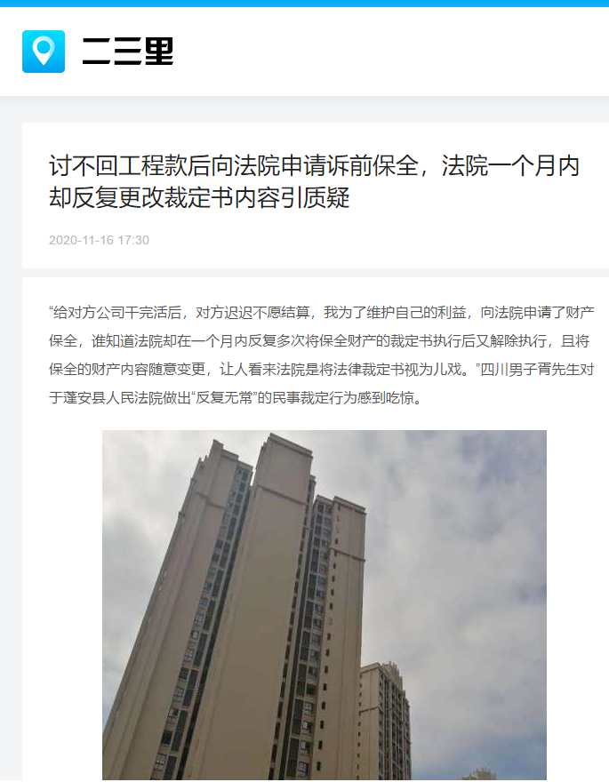 https://www.ersanli.cn/article.html?newsId=100018280022&s=20001518&type=1&appId=1&from=singlemessage&isappinstalled=0讨不回工程款后向法院申请诉前保全,法院一个月内却反复更改裁定书内容引质疑2020-11-16 17:30