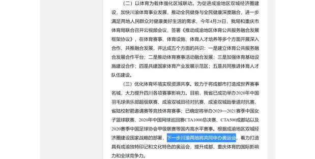 [size=0.19]四川省人民政府网站截图 [size=0.19]四川省体育局指出,为促进成渝地区双城经济圈建设,加快川渝体育事业发展,推动全民健身与全民健康深度融合,进一步满足两地人民群众对健康美好生活的需求,今年4月28日,我局和重庆市体育局联合召开云视频会议,签署《推动成渝地区体育公共服务融合发展框架协议》,在体育赛事、体育设施、体育人才培养等多个方面开展深入合作、共推融合发展,并达成五个方面的共识: [size=0.19]一是建立体育公共服务融合发展合作平台;二是推动体育赛事活动融合发展;三是加强体育基础设施建设合作;四是共建国家体育产业发展示范区;五是共同推进体育人才队伍建设。