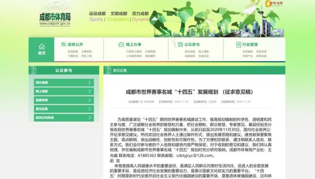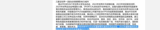[size=0.19]成都市体育局网站截图 [size=0.19]此外,《成都市世界赛事名城“十四五”发展规划 (征求意见稿)》提道:建立赛事引进前期研究和咨询论证机制,综合评估足球、篮球、田径、游泳、羽毛球、自行车、冰球等各类国际体育赛事的影响力和市场价值,引进一批发展前景广阔、市场开发价值较大、国际影响力较强、与成都城市形象契合度较高的国际单项体育赛事,持续提升成都国际显示度、知名度、美誉度。跟踪关注,积极探索申办2030年夏季青年奥林匹克运动会、2032年夏季奥林匹克运动会等大型综合性体育赛事的可行性。