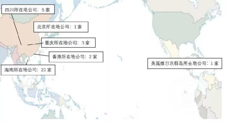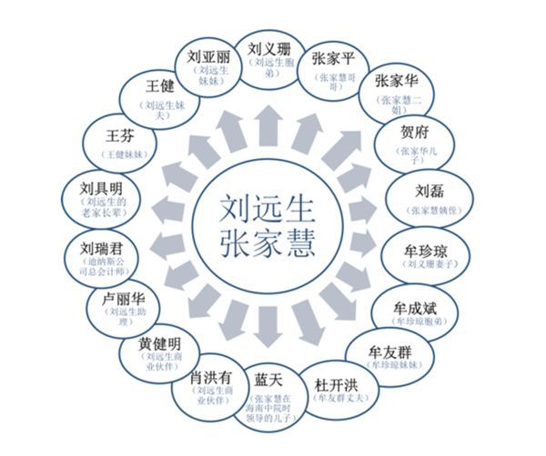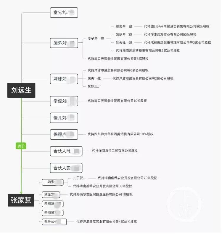 李富华提供证据称,张家慧夫妻共控股或实际经营公司达36家,其中包括3家境外公司。在这些公司中,由刘远生、张家慧的亲属、朋友持有的公司多达30家(包括3家境外离岸企业),注册地域分布于海南、重庆、四川、北京、香港和英属维京群岛。出任相关公司控制人或高管的,有张家慧的哥哥张家平、二姐张家华,姨侄贺府、刘磊;刘远生的胞弟刘义珊、弟媳牟珍琼,胞妹刘亚丽、妹夫王健,以及牟珍琼的弟弟牟成斌、妹妹牟友群夫妇等;还有刘远生长期的商业合作伙伴肖洪有、黄健明等。