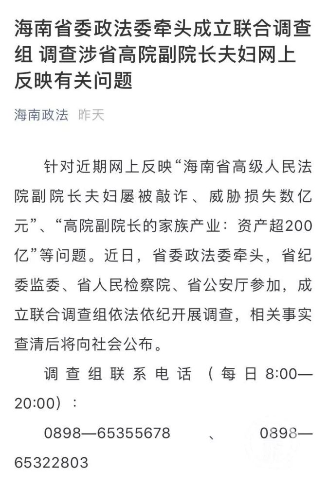 5月13日晚,海南省委政法委发布消息称:针对网络上反映的“高院副院长的家族产业:资产超200亿”等问题,政法委已牵头成立联合调查组开展调查。