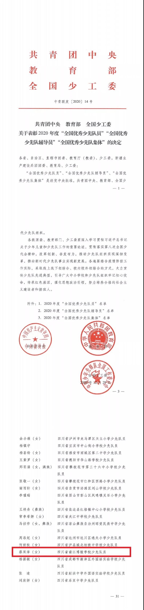 [即时新闻] 「南江博骏·喜报」|南江博骏学校蔡双泽同学喜获"全国优秀少先队员"称号 |