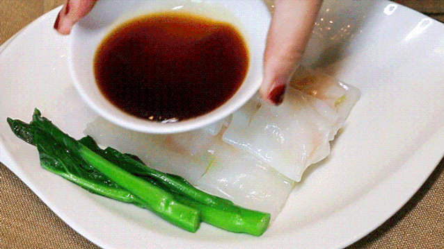 这道传统的肠粉,鲜虾被晶莹剔透的粉皮完美包裹,