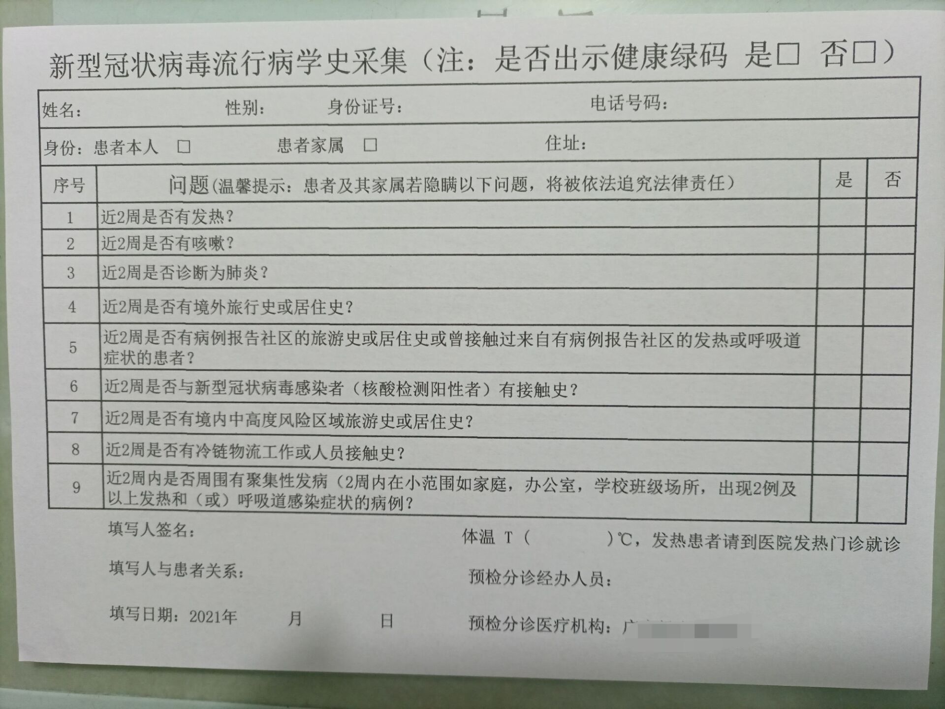 在中省国家法规政策的指导下,在四川省司法厅经办经省长签发基层医疗机构拨打120属合法权益的行政复议决定书后结束了广安汤才勇、代联波、张瑾、李黎等人炮制的基层医疗机构不能拨打120转诊的荒唐历史,在市卫生健康委员会新任领导的依法关怀、支持和指示下,广安市依法形成了新冠疫情时代的预检分诊、首诊、转诊和报告制度。 患者及其亲属必须出具国家政务平台或四川天府健康通的健康绿码、有效证件、带上医用口罩才能开始进入测体温、填写新型冠状病毒流行病学史采集表(预检分诊),如果患者或其亲属在填写新型冠状病毒流行病学史采集表或申请健康绿码时隐瞒病史导致新冠肺炎流行传播将依法承担刑事等法律责任。对不能出具国家政务平台或四川天府健康通的健康绿码、有效证件的患者,医疗机构有权拒接,但是患者属于急救对象时,医疗机构必须依法急救,非120网络医院还需拨打120转诊到能救治的120网络医院。基层医疗卫生机构通过预检分诊和首诊发现有发热、咳嗽、咳痰和气短等症状且没有可疑新冠肺炎的患者,引导患者到就近医院的发热门诊就诊,1小时内上报社区卫生服务中心或乡镇卫生院;通过预检分诊和首诊问病史发现发热、咳嗽、咽痛、嗅(味)觉减退、腹泻等症状的可疑新冠肺炎或发热原因不明的患者就地留观,并马上报就近社区卫生服务中心或乡镇卫生院派传染病专用车或拨打120依法转诊,如果患方擅自逃离可以拨打110协助。排除可疑新冠肺炎患者后,患者才能进入医疗机构内的普通诊室就诊。 患者因干咳一周来就诊,带上医用口罩出示了健康健康绿码、有效证件并填写了新型冠状病毒流行病学史采集表,就诊体验后称赞。但是,有的患者就诊根本不带证件,就必须要患者通过微信传来证件照片或回家拿,必须出示有效证件实名登记才能进入测体温、填写新型冠状病毒流行病学史采集表。出示有效证件后,有的患者操作不来申领健康绿码,填写新型冠状病毒流行病学史采集表也莫法填写,这个只有让预检分诊人员帮助他们叫患者的亲属申领。目前,广安的个体诊所、村卫生室在春节期间禁止接诊有发热、咳嗽等症状的患者,发热、咳嗽等药品已下架。