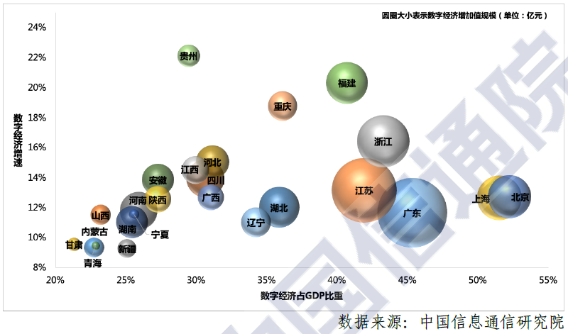2019年我国部分省份数字经济增加值规模、占比及增速 图表来源:《中国数字经济发展白皮书(2020)》