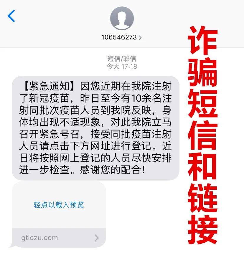 近期出现不法分子冒充疫苗接种单位发送紧急通知,称同批次多名疫苗接种人员出现不适现象,引诱群众点击含木马网址的虚假链接,套取其身份信息和银行卡资料,伺机实施诈骗。