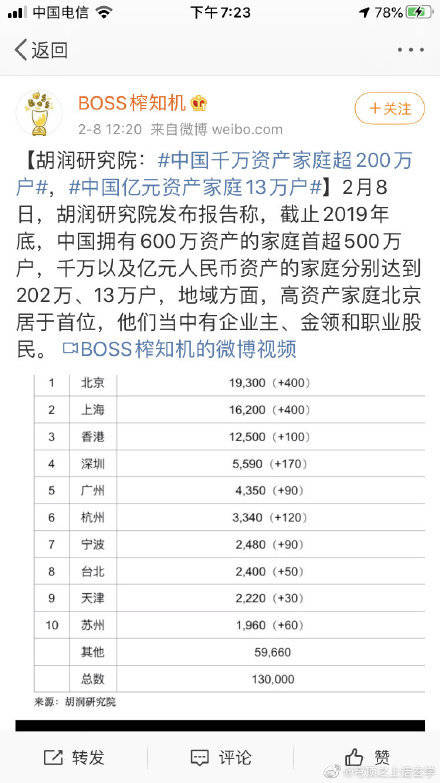 2月8日,胡润研究院发布报告称,截止2019年底,中国拥有600万资产的家庭首超500万户,千万以及亿元人民币资产的家庭分别达到202万、13万户,地域方面,高资产家庭北京居于首位,他们当中有企业主、金领和职业股民。