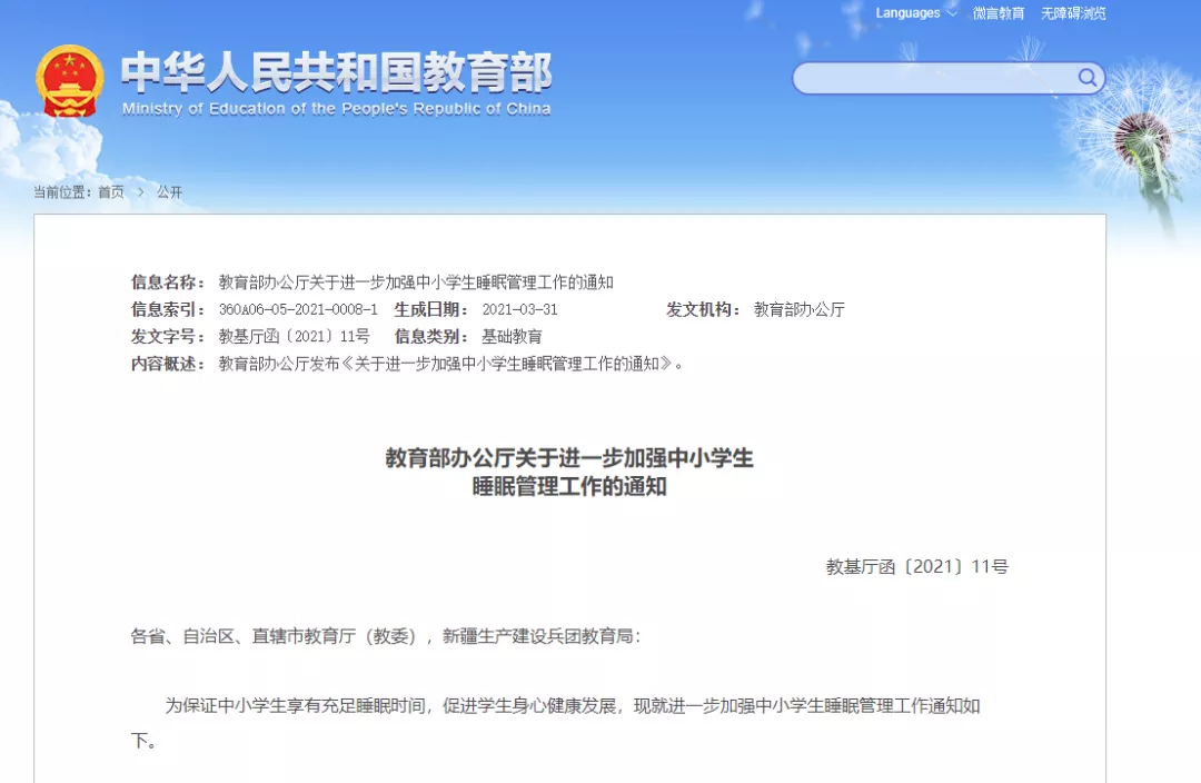 教育部官网截图 小学生每日睡眠要达10小时 初中生要达9小时