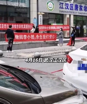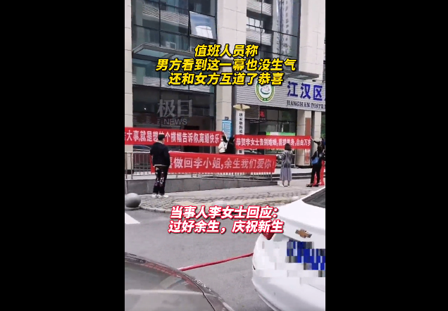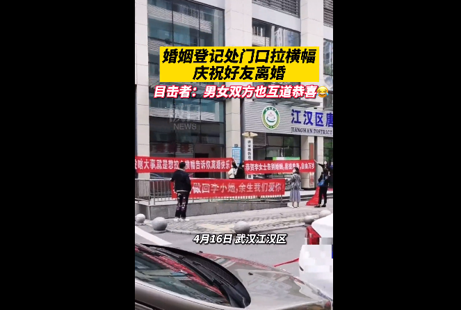 网传视频显示,在江汉区民政局婚姻登记处对面的唐家墩街政务服务中心门口,有几名男女拉了三个横幅。上面印有“没啥大事,就是想拉个横幅告诉你离婚快乐!”“恭贺李女士告别婚姻,喜提单身,自由万岁”“恭喜做回李小姐,余生我们爱你!”的字样。