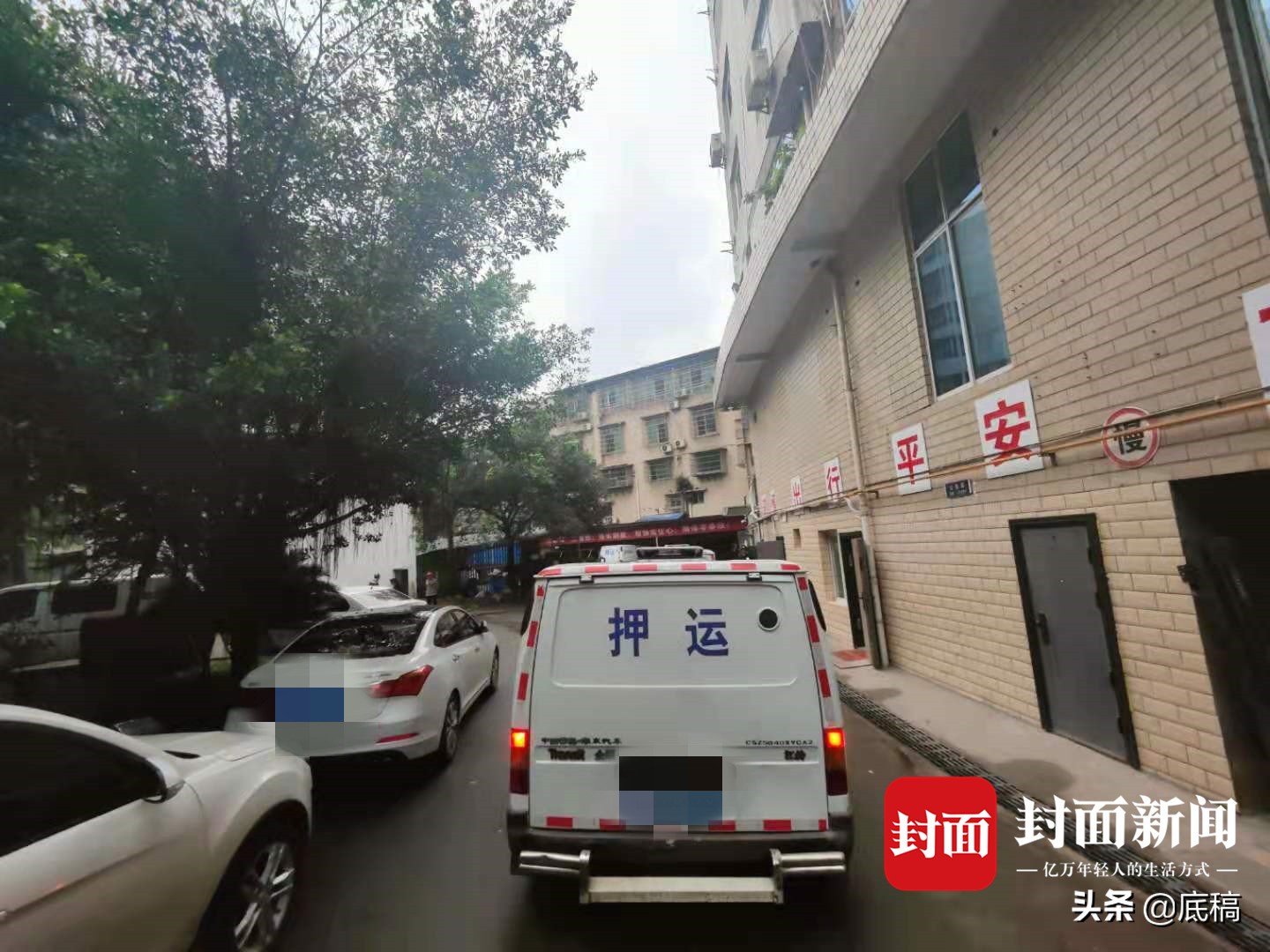 记者来到都尉路一段南充农商银行嘉陵支行后面的宿舍院里,左边是两个单元住宅楼,右边有一排库房,库房尽头是电子闸门围起的小院,不时有押运车驶入。小院闸门前,有两名保安驻守。院内外没有保安公司的挂牌信息。墙上有“谨慎出行”红色警示语,院内停有多辆押钞车。