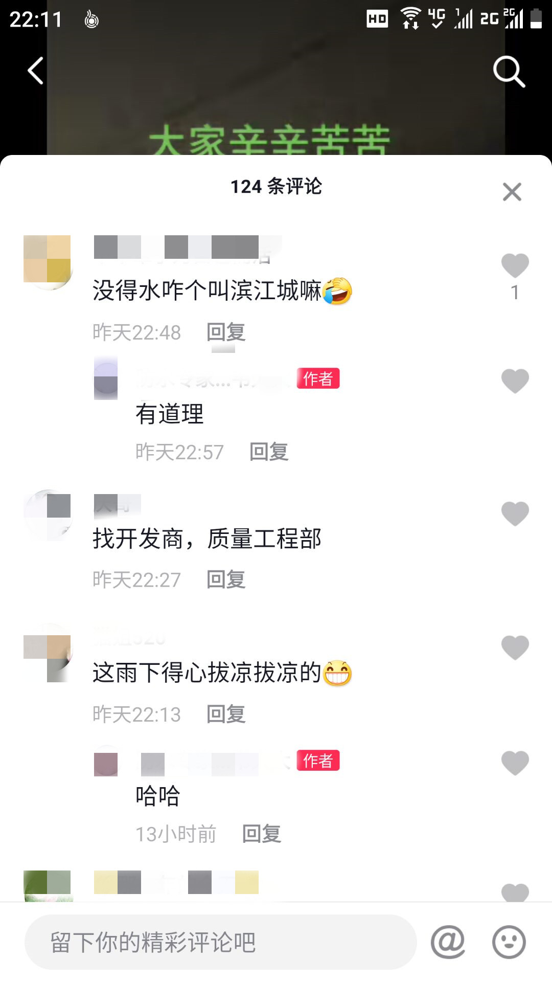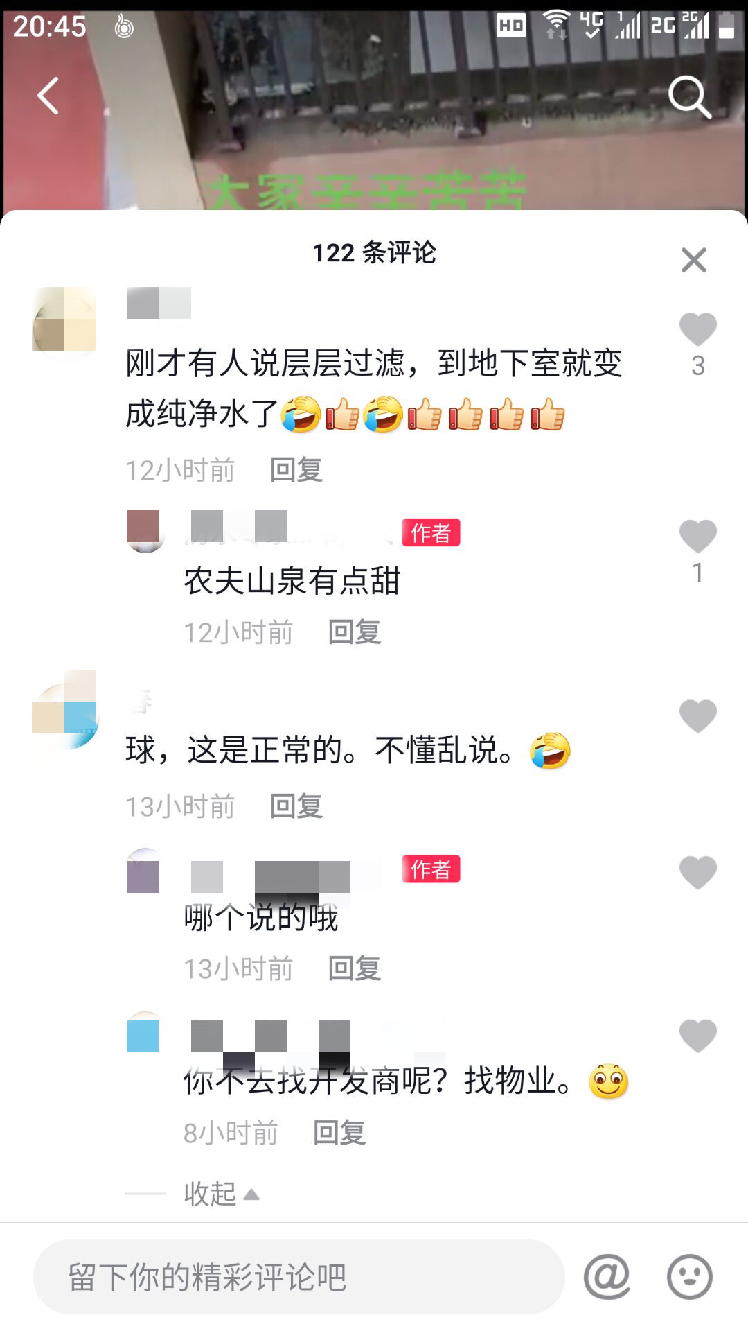 视频后的留言中,许多网友也各持己见的诉说了自己的看法,有网友调侃柏亚滨江城也算是高端?亦有网友说这是正常的,更有网友开玩笑的讲,没得水咋个叫滨江城麻