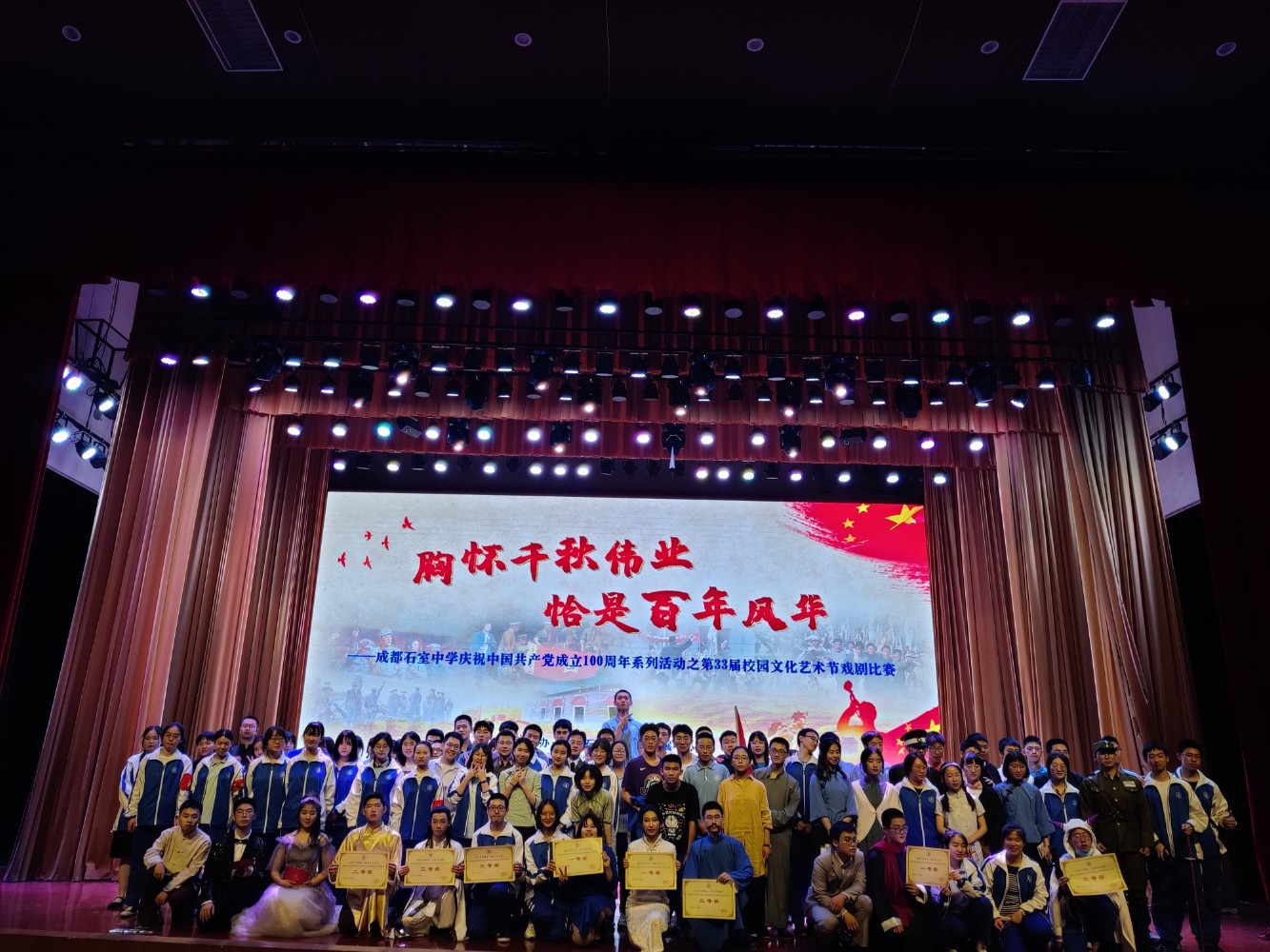 4月24日晚18时30分,北湖校区以“胸怀千秋伟业·恰是百年风华”为主题的庆祝中国共产党成立100周年系列活动之第33届校园文化艺术节戏剧比赛在多功能厅盛大举行。成都石室中学副校长赵清芳,学生发展中心主任罗朝军,教师发展中心副主任胡林,行政保障中心副主任秦松,对外交流中心主任助理龚承琳,高2022届年级组长谭勇,高2023届年级组长黄旭阳,语文教研组长、工会副主席江东,语文教研组副组长秦瑶,高2022届语文备课组长张期梦,高2022届语文老师唐彬杰、陈娟、邓彦玲、王子鹏、周莹老师莅临活动现场。