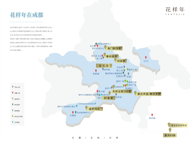 入蓉20年,花样年始终与成都同频共生。20余座人居、2座特色康养、2座度假酒店、5大商业及写字楼及1个艺术地标,每一座超越寻常的建筑美学,皆是西南的独特印记。从天府三街的福年广场到天府四街的香年广场;从天府五街东端的美年广场,到高端标杆花漾锦江......每一次热销红盘的佳绩,皆是市场的高度认可。