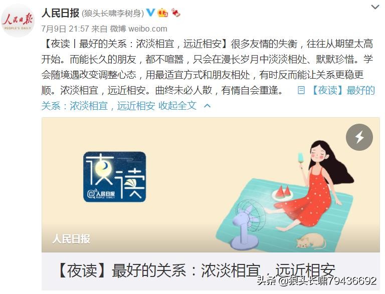 连日来,笔者卧病榻,未敢借口偷懒停笔。但强撑病体作文,提笔时频繁忘字或错字掉字,甚至语法不通的句子也随处可见。比如,昨夜辗转难眠写作的《网路,为何如此的坎坷难行?》一文,开篇首句应是“2009年”,竟笔误为“2021年”。实在贻笑大方矣! 今日昏昏欲睡地迟迟起床,强撑着不堪的病体打开电脑,对亦师亦友“人民日报官方微博”放置在笔者新浪微博里的《夜读丨最好的关系:浓淡相宜,远近相安》一文,读兴颇浓且有诸多感想泄露。