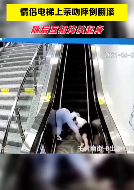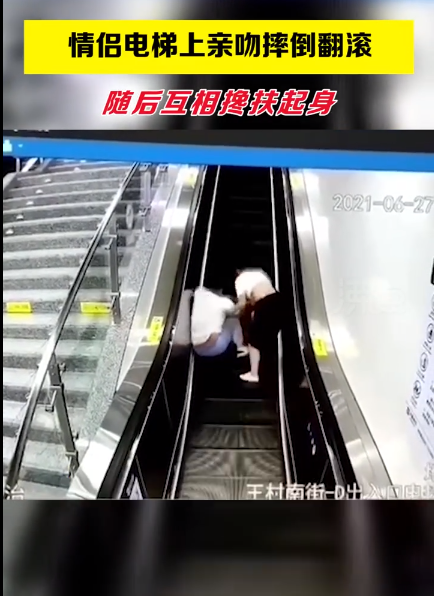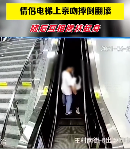 近日,山西太原一对情侣在乘坐电动扶梯时热吻,随后不慎摔倒。