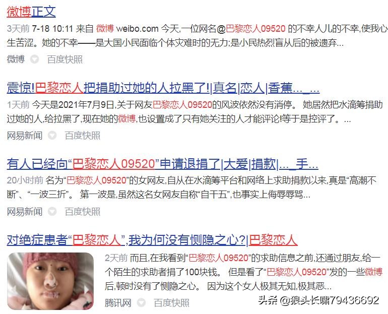 今(21)日,笔者在发表的《巴黎恋人:痛改前非心存善念》一文中引用《咒骂方方早死的巴黎恋人自己得了癌症 但方方的粉丝纷纷伸出援手》一文,现在点击社交网站网页搜索,竟然会变成了“404”。匪夷所思! 但相关话题很多,有人想抹也抹不掉。其中《 震惊!巴黎恋人把捐助过她的人拉黑了!》一文讲述的内容,确实令人闻之震惊! 该文称: “今天是2021年7月9日,关于网友巴黎恋人09520的风波依然没有消停。她居然把水滴筹捐助过她的人给拉黑了,现在她的微博,也设置成了只有她关注的人才能评论!” 另有网友红歌之声发表《这位正能量爱国者得了重病没钱医治,大家要不要帮她?》一文,题中就问得很好,也很值得所有不计前隙仍愿捐款相助巴黎恋人09520医治癌症的善心网友们警醒。 该文称: “有时朋友圈转载一些民生疾苦的文章,总是经常被别人批评太负能量,甚至还举报,微信号都因‘散布谣言’被警示过几次了。有时也想试着发点正能量东西,但感觉有违内心,所以就干脆不发了。” “不过,昨天一个爱国者短短一年半就从正能量转为负能量,我还是写出来分享给大家,看能不能受点启发。” “ 这位爱国者网名叫‘ 巴黎恋人’,看起来很有国际范,但是很左,是个典型的排外型愤青。先看她的一则发布于2020年6月25日的正能量消息:”