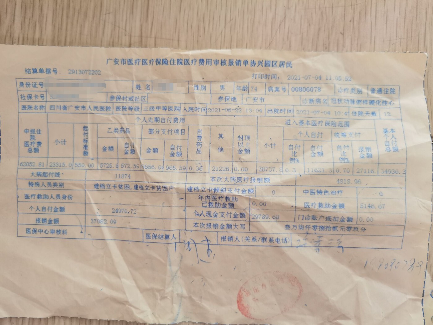 2021年6月22日10时左右,家住广安协兴园区浓溪镇红色村的某某(74岁)出现胸痛胸闷于是拨打120,120调度了广安市人民医院的120救护车及其医护人员出诊到其家,患者13时4分抵达广安市人民医院入院诊断为急性心肌梗死,不知广安协兴中心卫生院、浓溪镇卫生院是否有120救护车或院前医疗急救服务网络。按照院前医疗急救服务区域划分,广安协兴园区属广安市中医医院的院前医疗急救服务区域,但广安120指挥中心调度的广安市人民医院的120救护车及其医护人员出诊,因此,广安市院前医疗急救服务制度和监管有待依法完善。 该患者在广安市人民医院住院12天花费62052.81元,经历了冠状动脉造影和冠状动脉支架植入等治疗,自费金额23315元,城乡居民医保报销70%,城乡居民医保大病报销4818.96元,因患者家是建档立卡贫困户脱贫,医疗救助5146.67元,患者自付金额24970.72,但广安市人民医院叫患方东凑西借预交了5.1万元,出院诊断为:1、冠状动脉粥样硬化性心脏病,2、冠状动脉支架植入后状态,3、冠状动脉造影术后,4、高血压,5、糖尿病,6慢性胃炎。建档立卡贫困户脱贫后因病又贫穷了的根源在哪里,首先该患者的生活方式不佳,经常吃猪油肥肉,还有抽烟,还有不按时吃高血压、糖尿病药等,说明健康教育健康促进还未见效果。其次,广安市二级以上医院、广安协兴中心卫生院、浓溪镇卫生院和浓溪镇红色村卫生室是否有全科医师组成的家庭医生签约团队对该患者的高血压、糖尿病进行慢病管理。第三,院前医疗急救体系制度和分级诊疗双向转诊制度形同虚设有待依法建章立制完善。如果我们的全科医师组成的家庭医生签约团队服务好了,高血压、糖尿病患者不发展成心肌梗死,给医保基金和财政经费节约3万多元,给患者节约2万多元. 该患者的详细就医经历值得广安各级党委政府、广安市卫生健康、医保、财政等系统值总结和反思,健全完善院前医疗急救体系制度、分级诊疗双向转诊制度、全科医师组成的家庭医生签约团队慢病管理运营考核制度势在必行。