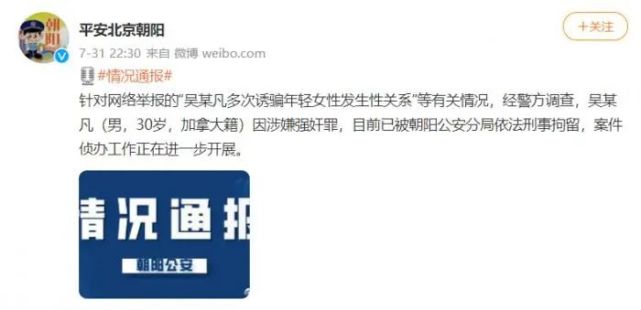 [color=rgba(0, 0, 0, 0.85098)]7月31日,平安北京朝阳微博晚间通报,针对网络举报的“吴某凡多次诱骗年轻女性发生性关系”等有关情况,经警方调查,吴某凡(男,30岁,加拿大籍)因涉嫌强奸罪,目前已被朝阳公安分局依法刑事拘留,案件侦办工作正在进一步开展。