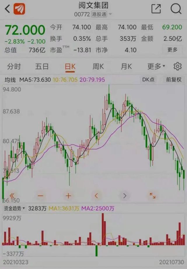 [color=rgba(0, 0, 0, 0.85098)]截至发稿, 阅文集团股价为72港元,自吴亦凡风波被爆出后,其股价就一路下跌,距离7月19日收盘价的81.45港元,已跌去13.12%。