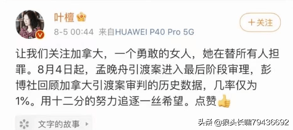 截图:来自网络 叶檀说:“8月4日起,孟晚舟引渡案进入最后阶段审理,彭博社回顾加拿大引渡案审判的历史数据,几率仅为1%。用十二分的努力追逐一丝希望。点赞(表情包)。” 于是网上炸锅了:“叶檀的形象可以说是跌到了谷底,口碑差得不能再差了。引发炸锅的主要原因,是叶檀微博中的这句话:“她在替所有人担罪。”