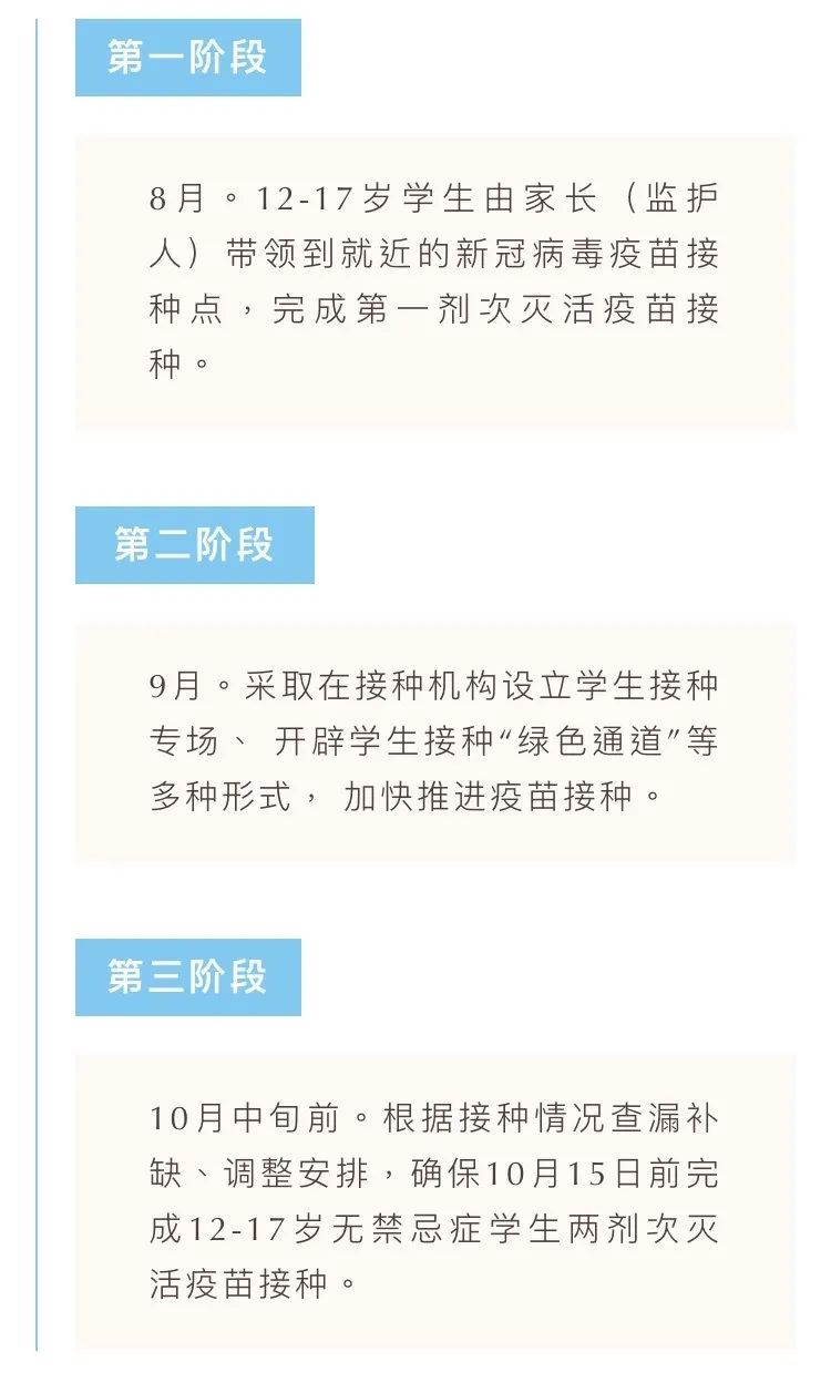 第二阶段:9月份。由县教育、卫生健康行政部门结合当地实际,共同研究制定本地本校在校学生接种安排。将采取在学校规范设置临时接种点、在接种机构设立学生接种专场、开辟学生接种“绿色通道”等多种形式,完成15-17岁学生第二剂次灭活疫苗接种和12-14岁学生第一剂次灭活疫苗接种。