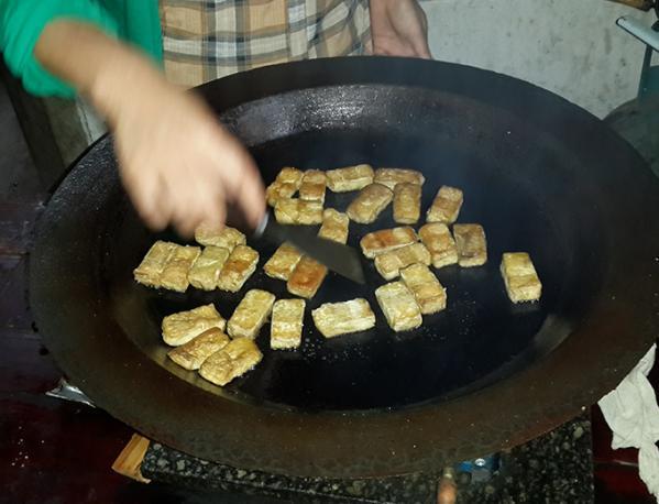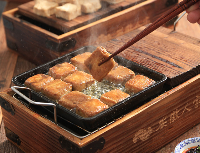 发酵好的毛豆腐会被放入生铁锅中煎制,将锅放在旺火上,倒入菜籽油,菜籽油可增加食材的香味,等到油烧至七成熟时,将毛豆腐放入锅中,表面的绒毛会随着锅内温度的上升,逐渐溶解附着在豆腐表面,待表皮起皱时,涂抹酱料,撒入葱花,起锅装盘。鲜醇爽口,芳香诱人。