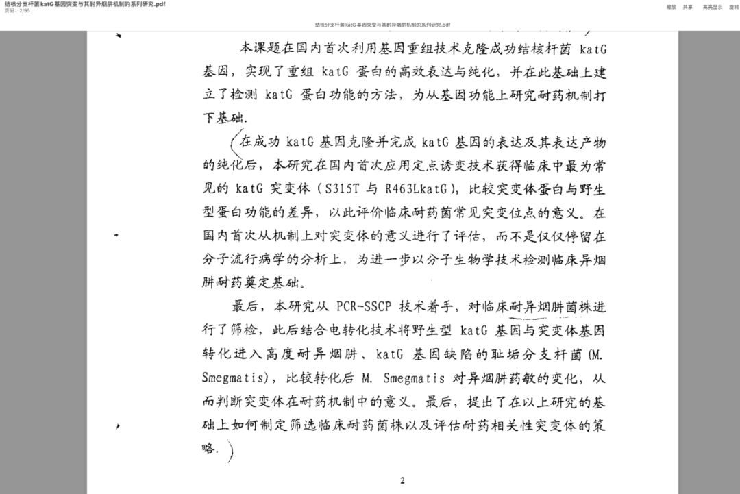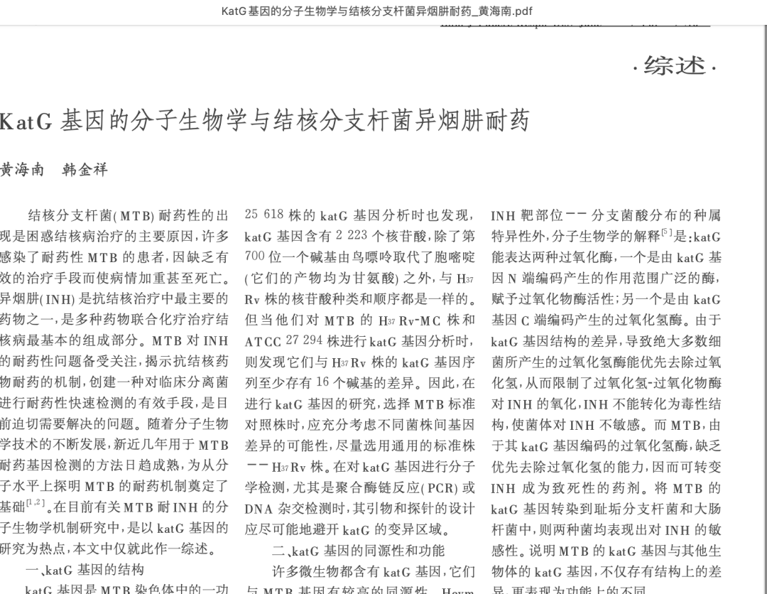 黄海南教授的论文题为《KatG基因的分子生物学与结核分支杆菌异烟肼耐药》,这篇论文就是一篇对国内外研究情况的综述。