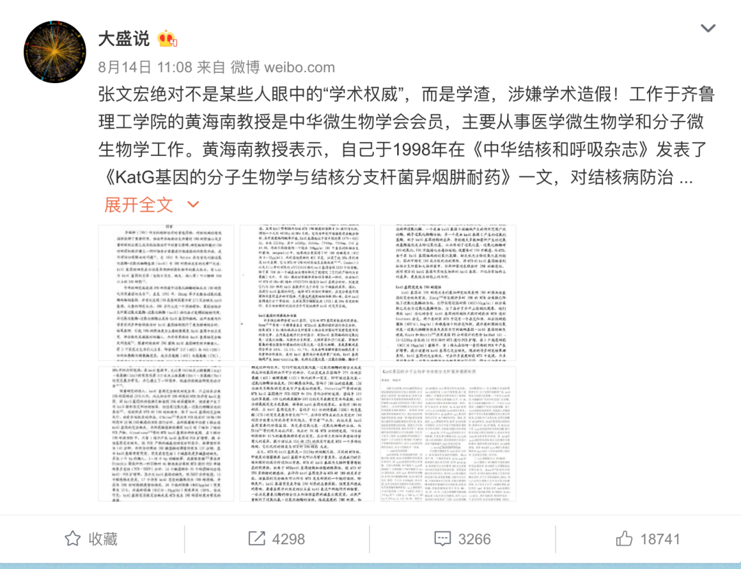 一个叫“大盛说”的网友,微博介绍“保护着你们这个国度的盛灵”,发文说张文宏2000年的博士论文,抄袭了齐鲁理工学院的黄海南教授1998年发表在《中华结核和呼吸杂志》的论文《KatG基因的分子生物学与结核分支杆菌异烟肼耐药》。说这是“学渣拿着学霸的研究成果说成是自己的,然后顺利在上海医科大学毕业了,通过油嘴滑舌的技能成为了‘上海防疫英雄’。”