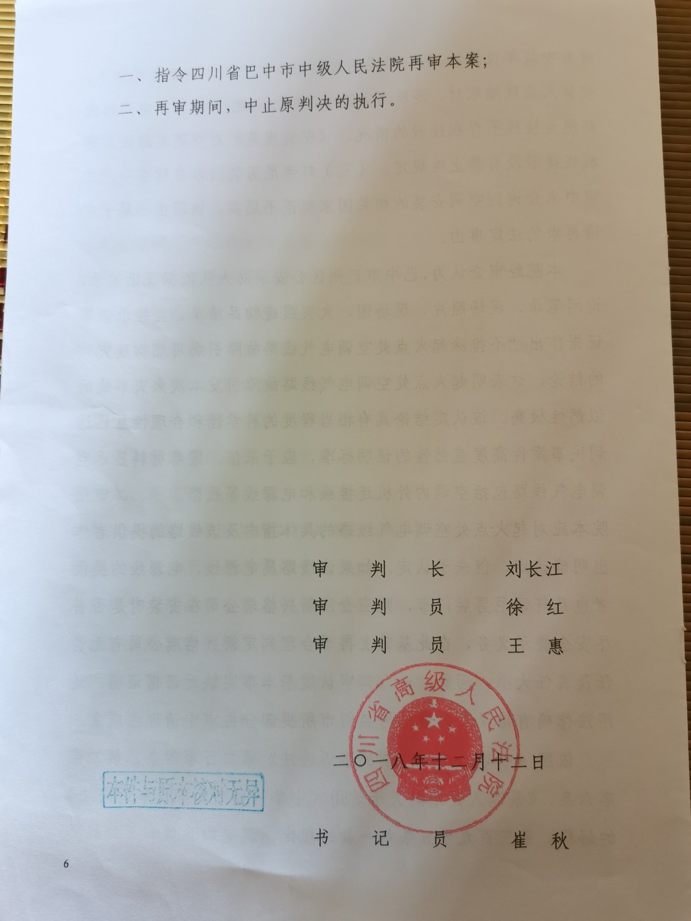本人收到中院的判决书以后,觉得巴中的司法被黑暗笼罩,决定向省高院申请再审,在高院的再审判决书收到后,感觉到拨开云雾见青天,能还回我的公道,随之在高院明确中止原判决的执行,指令巴中市中级人民法院再审本案。