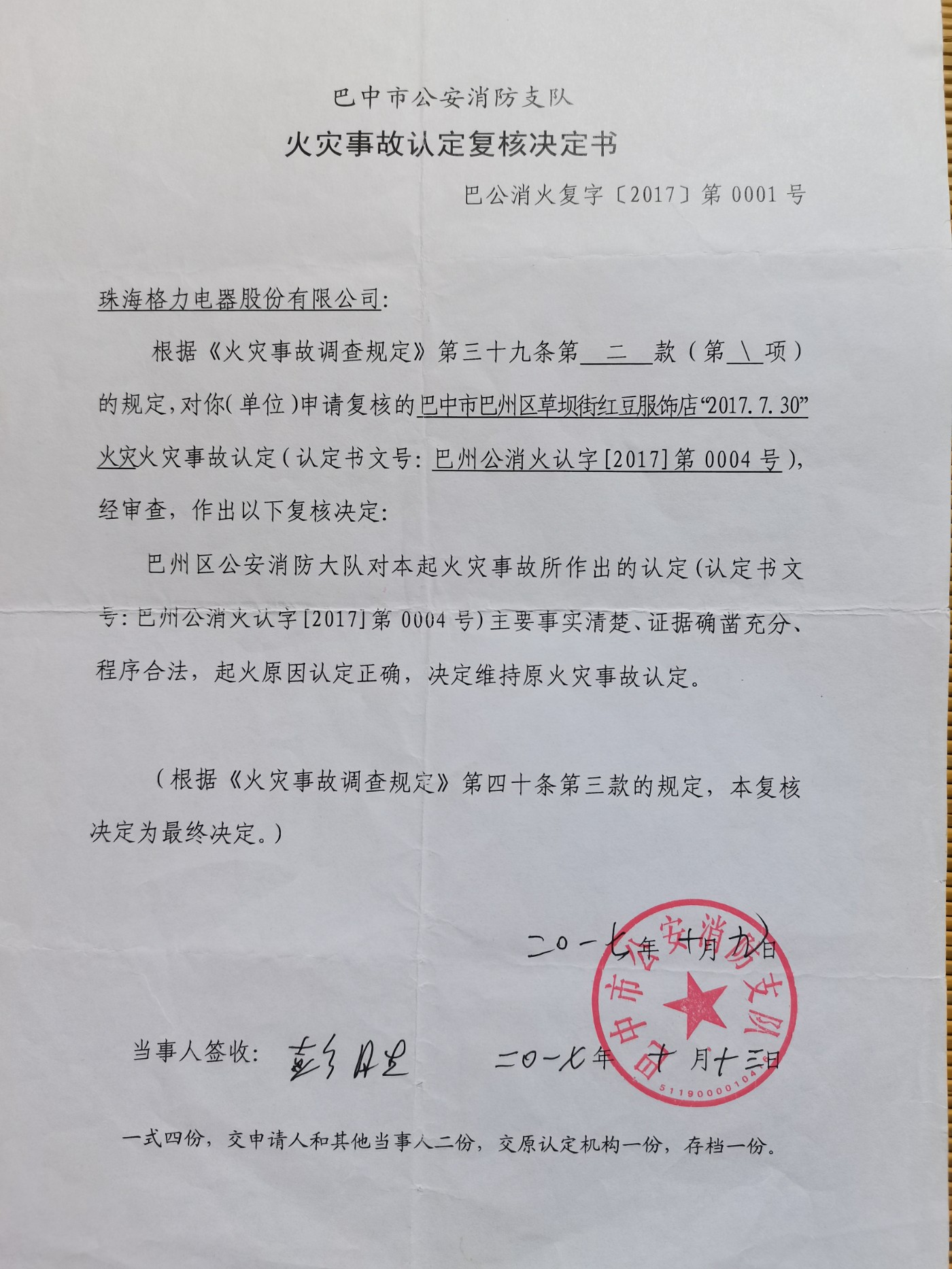 在经过长达28天的等待后,消防部门在通过省级鉴定机构权威鉴定,巴中市巴州区公安消防大队于2017828日出具了《火灾事故认定书》(巴州公消认字﹝2017﹞第001号),报告中明确指出经过现场勘验、调查询问、有证据能够排除放火、自燃、雷击、用火不慎、外来火源、静电等原因引起火灾的可能,不能排除起火点处空调电气线路故障引燃可燃物致灾