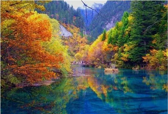 水是九寨沟的精灵,湖、泉、瀑、滩连缀一体,飞动与静谧结合,刚烈与温柔相济。时而疾速飞奔向前,时而舒展缓流,时而横空出世各自不同的特性,把所经之地分割成了各具春秋的不同景色。
