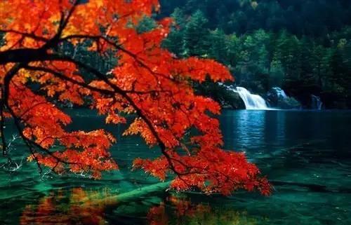 火红的枫叶,与远处的青山,碧绿的清潭,湍急的落水,交相辉映,在粼粼的微波中,疏影在横斜,轻轻荡漾。