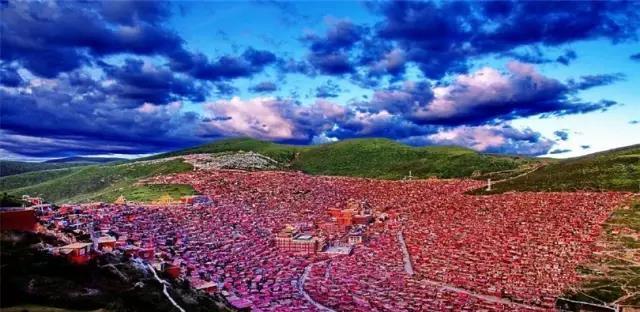 色达因其规模宏大,现已成为世界旅游胜地,每天车水马龙,游人如织。木盒般的房子,铺满整个山沟,密密麻麻。房子外面也是一色的红色,仿佛红色的海,铺列在山坡上。谁也不会想到,在这近乎与世隔绝的山沟里,居然有这么多人在研修经文、弘扬佛法。