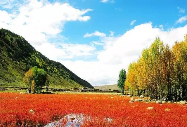 烈焰般的红草地、金黄色的杨树林与蓝天白云交相辉映,仿佛让人置身于色彩的海洋。仰望着夕阳后的蓝天,大朵大朵的白云在天空中肆意漫游,习习的晚风带着一丝凉意悠然而来。一颗无绪的心尤如云朵一样,在情愫的天空里弥漫着。