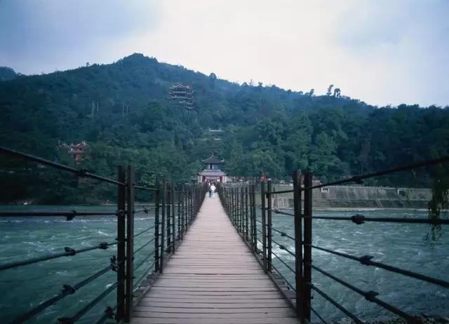 走在模板铺成的吊桥上,看两岸青翠的山,远处的亭台,桥下翻涌不息的水,听湍急河水怒吼。