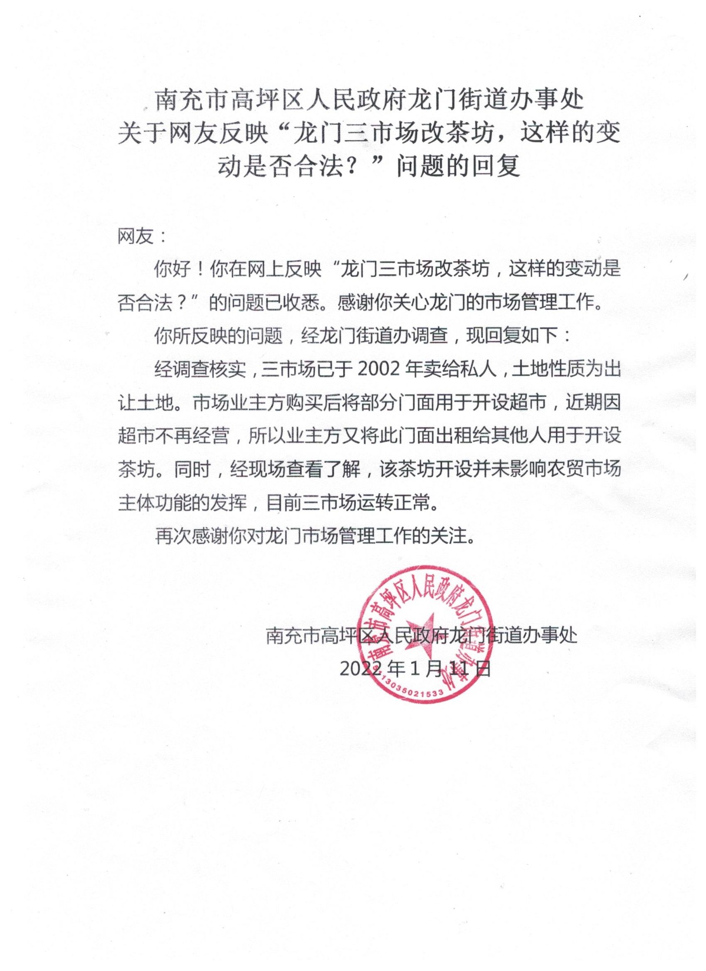 [四川群众呼声] 龙门三市场改茶坊,这样的变动是否合法?[已回复] |