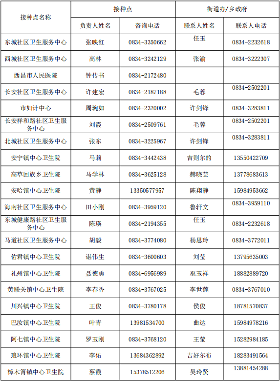 西昌市新冠病毒疫苗接种点、乡镇(街道)咨询电话 |