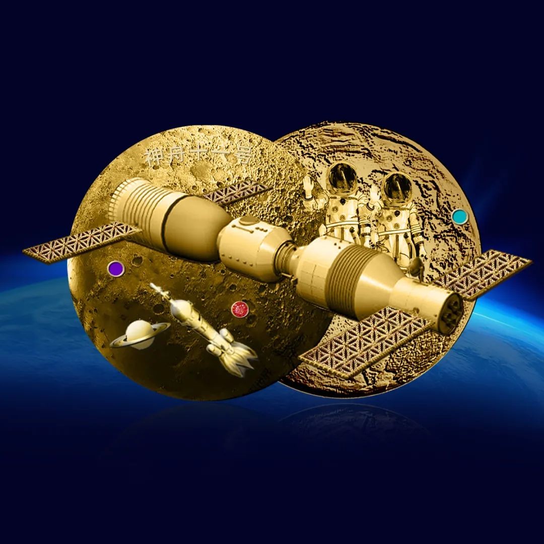 神舟十四号飞船纪念章主图为中国天宫空间站、3名航天员、星际图、星球,背景是星河璀璨的宇宙星系。中国神舟飞船纪念章大全限量发行:1万套,共14枚,收录了神舟一号到神舟十四号所取得的重大成就,一套即将神舟系列全部集齐!