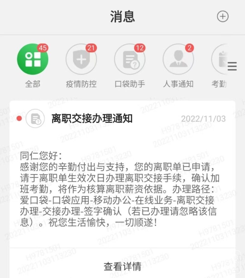 11月2日,陈伟坤在线上办理离职,隔天收到交接通知。