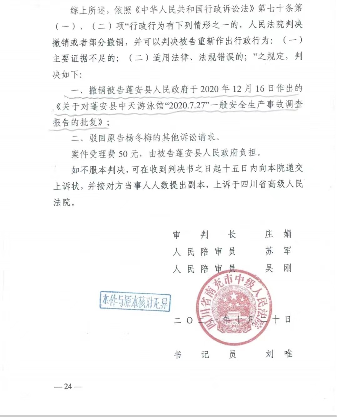 杨冬梅提起行政诉讼,要求撤销蓬安县人民政府于2020年12月16日作出的《关于对蓬安县中天游泳馆“2020.7.27”一般安全生产事故调查报告的批复》,一审法院认为游泳馆严重违法违规操作导致王福顺溺亡,蓬安县政府作出的批复认定事实不清,证据不足,且适用法律错误,故判决撤销了该批复。判决书文号是(2021)川13行初58号行政判决书。蓬安县政府不服,提起上诉,四川省高级法院作出了维持一审判决,判决书文号(2021)川行终2063号。
