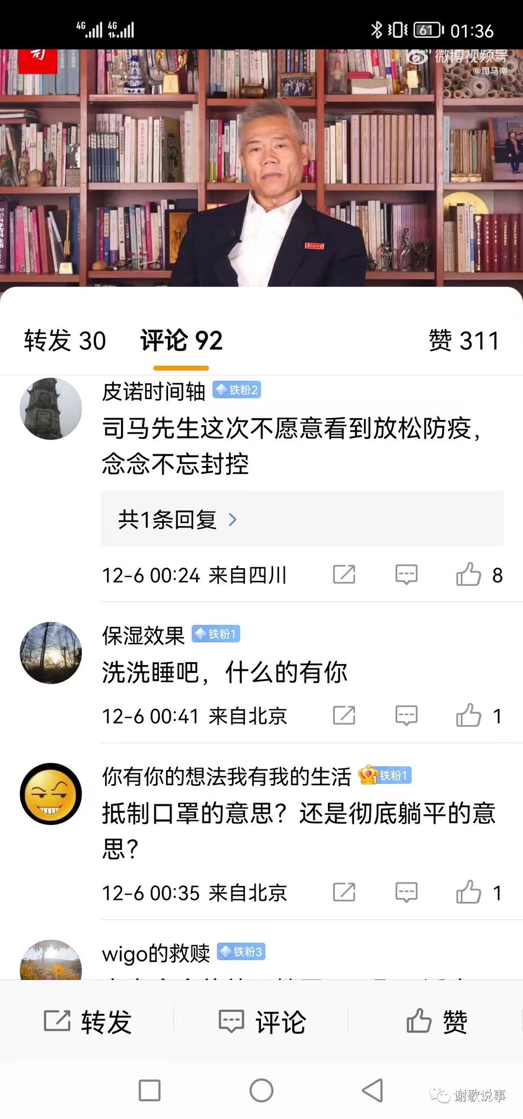 网友:司马先生这次不愿意看到放松防疫,对封控念念不忘。