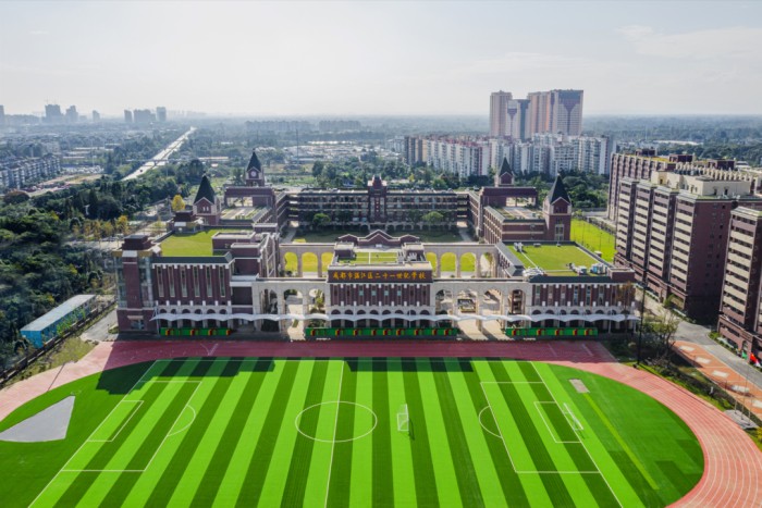 成都市温江区二十一世纪学校作为北京市二十一世纪国际学校在京外的第一所分校,于2017年6月正式落户成都,2020年9月正式开学。校区占地面积173亩,总建筑面积19万㎡,设计以场地及周边的地理生态环境为出发点,以四川文化中的精髓“蜀学文化”为依托,以“英伦格局”和“学院空间”为目标,学校主体建筑从空中看呈现C-I-O格局,寓意学校的办学宗旨:China-International-Open:培养具有中国灵魂、国际视野和跨文化交流能力的社会主义接班人,做豪迈的中国人!