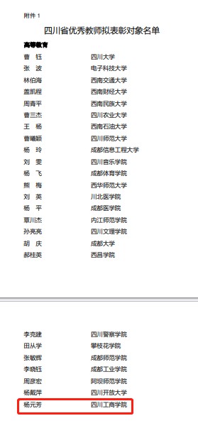 近日,根据《四川省教育厅 四川省人力资源和社会保障厅关于评选表彰四川省优秀教师、优秀教育工作者和教育工作先进集体的通知》,经学校(单位)、市(州)推荐、逐级审核,省评选表彰工作领导小组评选,四川工商学院下属马克思主义学院教师杨元芳教授被评为“四川省优秀教师”。在2023年评选活动中,全省“高等教育”共评选出25名“四川省优秀教师”,该校杨元芳教授是唯一入选的民办高校教师。