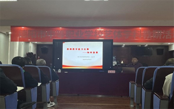 活动伊始,德阳市教育科学院教研员钟强阐述了本次教研活动的目的和意义,并强调了教研活动中的要求。 随后,孝泉师范学校王建明老师围绕“中等职业学校音乐、美术、体育学科教师教学能力大赛如何备赛”进行了精彩的专题讲座。他从指导思想、大赛要求、文档资料、视频材料、评分标准等方面对教师能力大赛的准备工作进行了详尽解读,对2023年省市能力大赛基本情况进行了介绍,并从备赛角度对提高教师教学能力大赛成绩提出了一些具体建议。 当日下午,中等职业学校美术学科教师(黄许职业中专学校——汪杰)、四川省教师教学能力大赛体育一等奖教师(四川省商贸学校——张宇)、四川省教师教学能力大赛舞蹈二等奖教师(四川省商贸学校——金超山)分别开展了精彩纷呈的示范课。 课堂观摩以后,各学科小组分别开展了热烈的交流教研活动,对示范课进行点评,各校教师之间交流经验,共同探讨如何提升教师专业素养,以及如何进一步提高教学效果。
