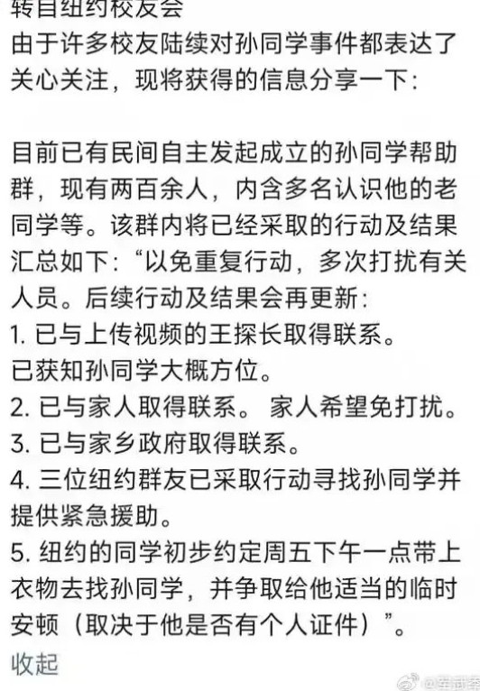 江阴市民求助中心在官方平台发布了一条关于孙某在美国的视频并称,“孙某原籍江阴市长泾镇,智商极高。升入南菁中学后,被复旦大学少年班物理专业录取,本科毕业后被李政道教授选中去美国深造,硕士、博士毕业后,再留校读博士后。多年前,孙博士便有归国意愿,囿于美国对华裔人才的限制一直没能成行。孙博士经受人生多重打击后,在纽约曼哈顿唐人街流浪数年,食不果腹。而今,年过五旬的他回家的念头愈发强烈,期待在复旦大学和南菁中学校友的关爱下,孙博士早日回到魂牵梦萦的故乡。”